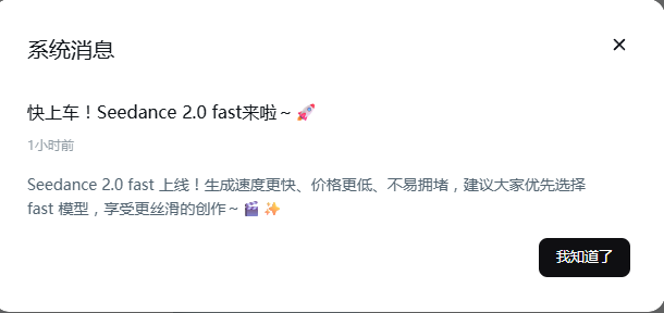哈哈哈哈,即梦紧急上线了一个seedance2.0 fast模型分流,终于不用开了会员都要等13个小时才能生成一个15秒的视频了🥲