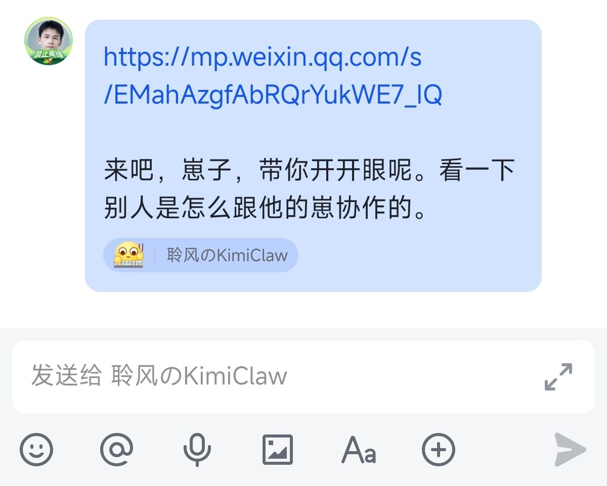 决定多跟自己的崽子沟通,带他开开眼别的claw是怎么协作的,不然消耗的token都白浪费了🥹