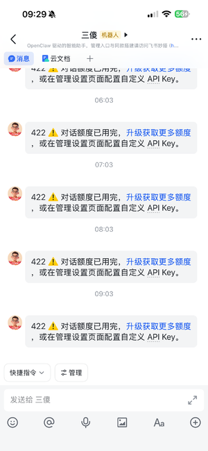 “422⚠️对话额度已用完,升级获取更多额度,或在管理设置页面配置自定义 API Key。”